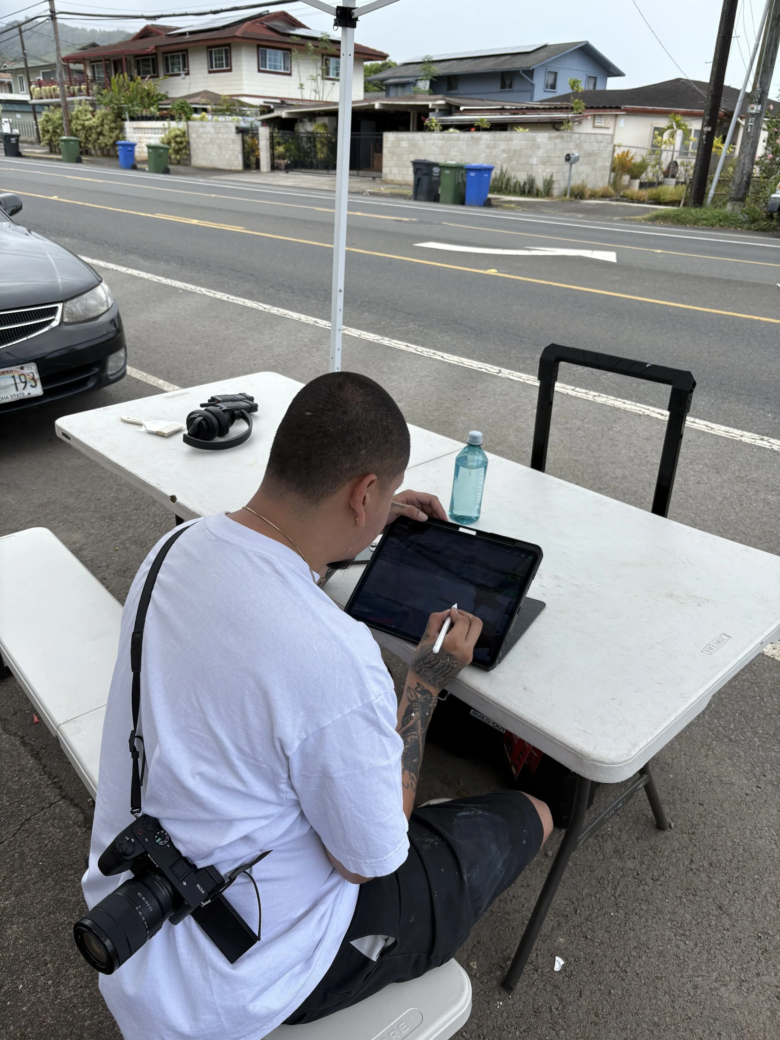 The design features “Kalihi Valley” in bold lettering in the center. On the right, there is a portrait of Joseph Kahahawai Jr., which represents our ancestors and remembering their stories. He has become a big part of KVIBE’s foundation, as one of the story stops during the annual Ahupuaʻa Ride is visiting his gravesite at Puea Cemetery. In an Instagram post, Alfonso says, “this was my fourth portrait of him. His story is tragic but important, and I believe more people—especially outside Hawaii—should know his name and what he stood for.” The background is a Hawaiian landscape, featuring the ocean, mountains, and plants. It was important to KVIBE to include the ocean and waʻa in the mural because it shows their connection to their ancestors, as they often refer to bikes as “urban waʻa”, used to explore and build their community. The mountains represent their relationship with Hoʻoulu ʻĀina. Alfonso also chose to do the majority of the art in grayscale to give it a historical feel.