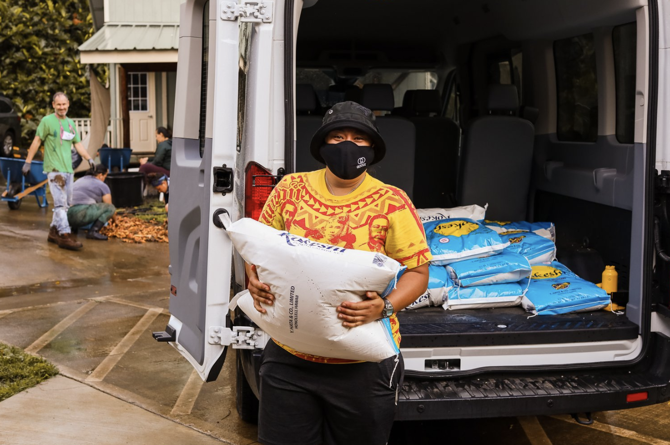 Le Stanley is sorting through rice bags in a makeshift pantry. Eventually those bags along with other food and essential items will be distributed to community members in need as well as families who have tested positive for COVID. Le has been leading the effort for a couple of months now with a small team of KKV responders. Her hui shops for non-perishable goods and home essentials, takes inventory, stocks, restocks, sorts, organizes, assembles ʻohana boxes, and then delivers to families.