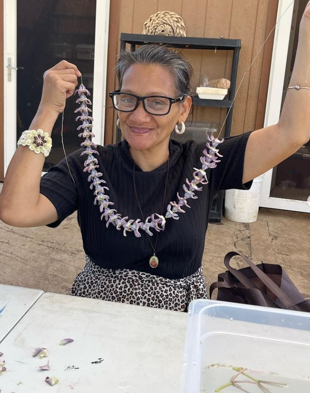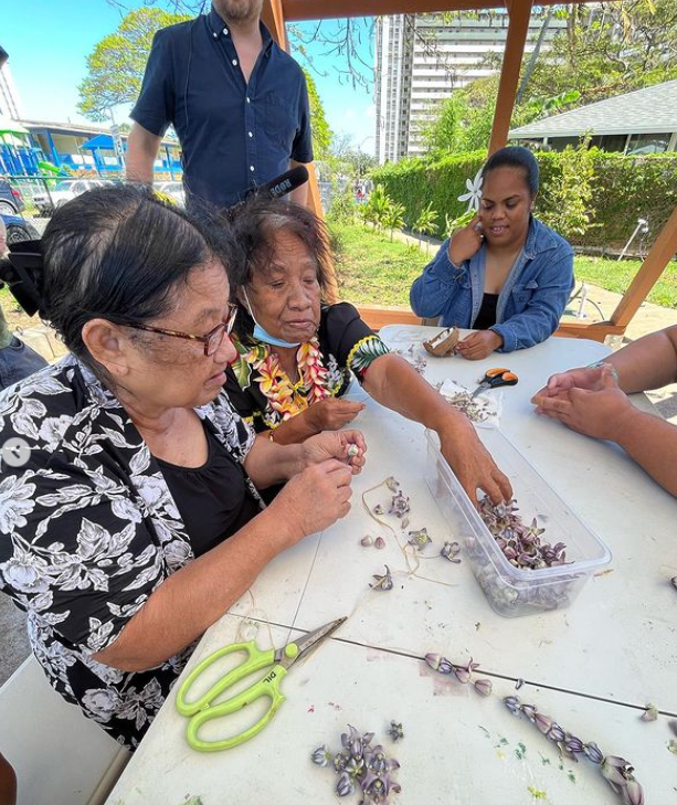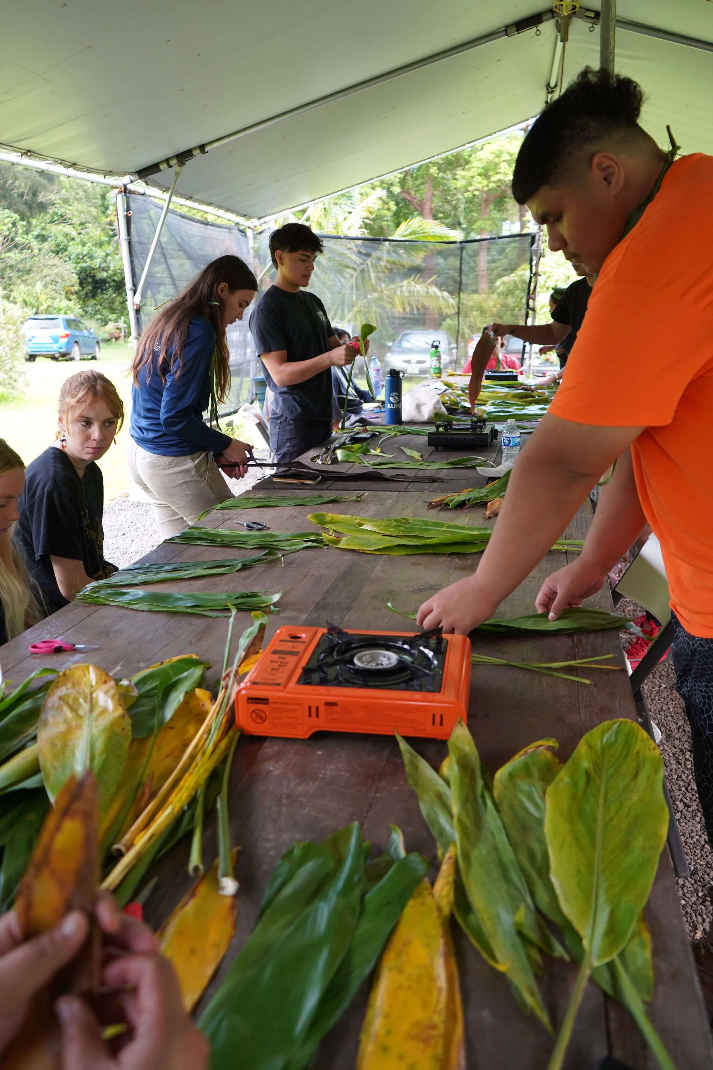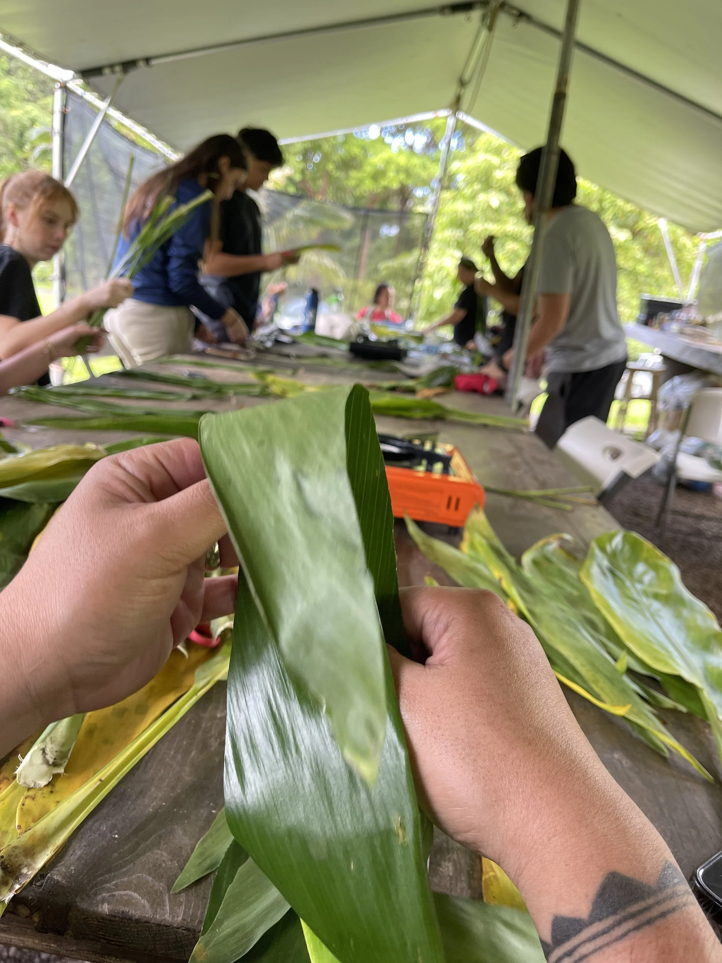 Learning how to make lei lāʻī (ti leaf).